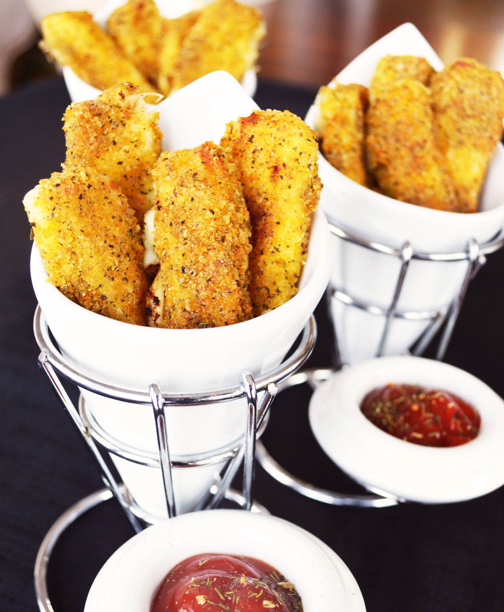 Ingrédients: Mozzarella, chapelure, farine, épices, oeufs.
