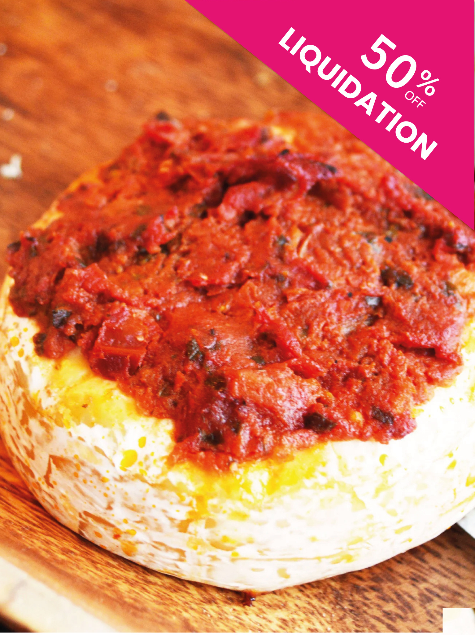 Ingrédients: Brie, pesto de tomates séchées (huile, tomate séchée, câpre, cassonade, noix de Grenoble, épices).